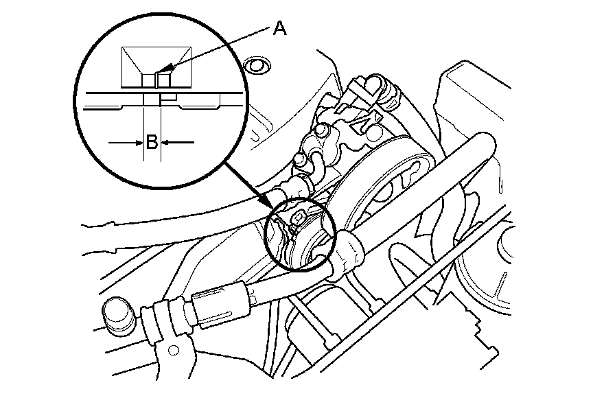 Check the position of the auto-tensioner indicator's pointer (A) is within the standard range (B) as shown. If it is out of the standard range, replace the