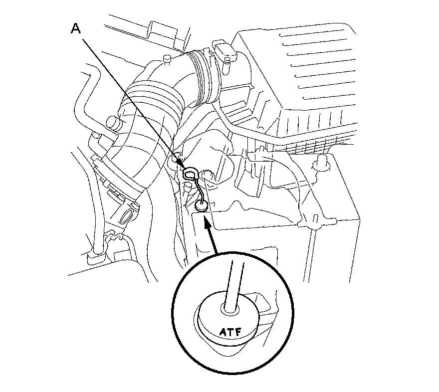 5. Insert the dipstick (A) back into the transmission with the letters "ATF" pointing toward the front of the vehicle.