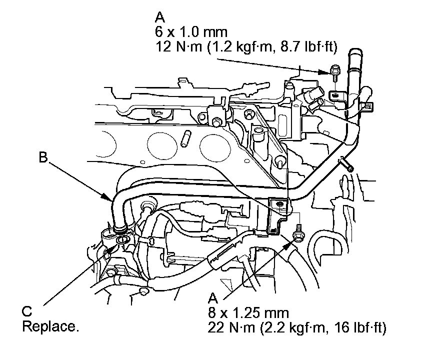 3. Remove the connecting pipe mounting bolts (A), then remove the connecting pipe (B).