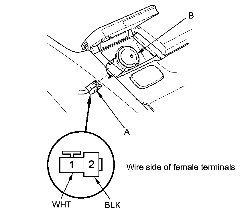2. Disconnect the 2P connector (A) from the front accessory power socket (B).