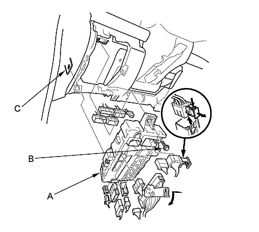 4. Remove the mounting bolt (B), release the tab (C), and pull the driver's under-dash fuse/relay box away from the body.