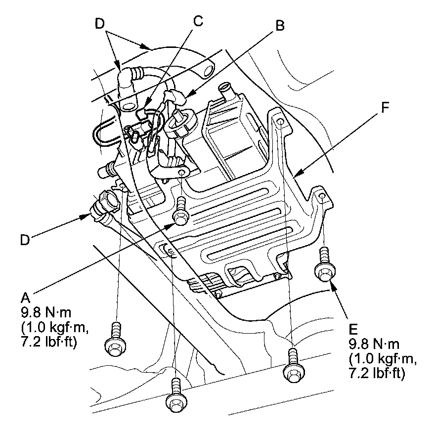 Remove the bolts (E), and move the EVAP canister assembly (F) to the rear.