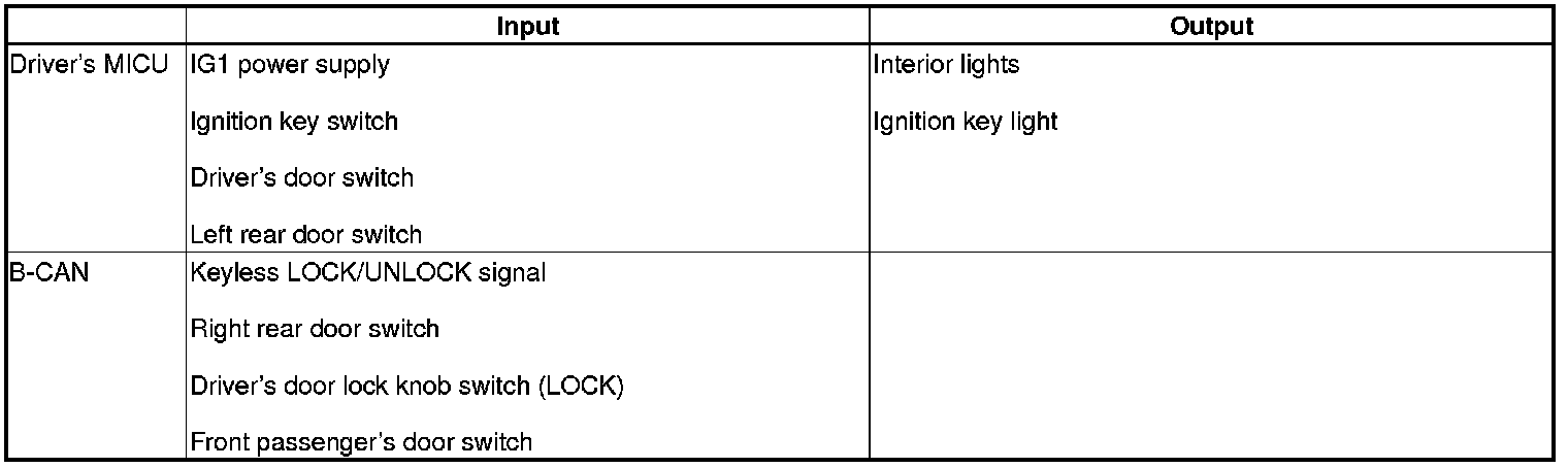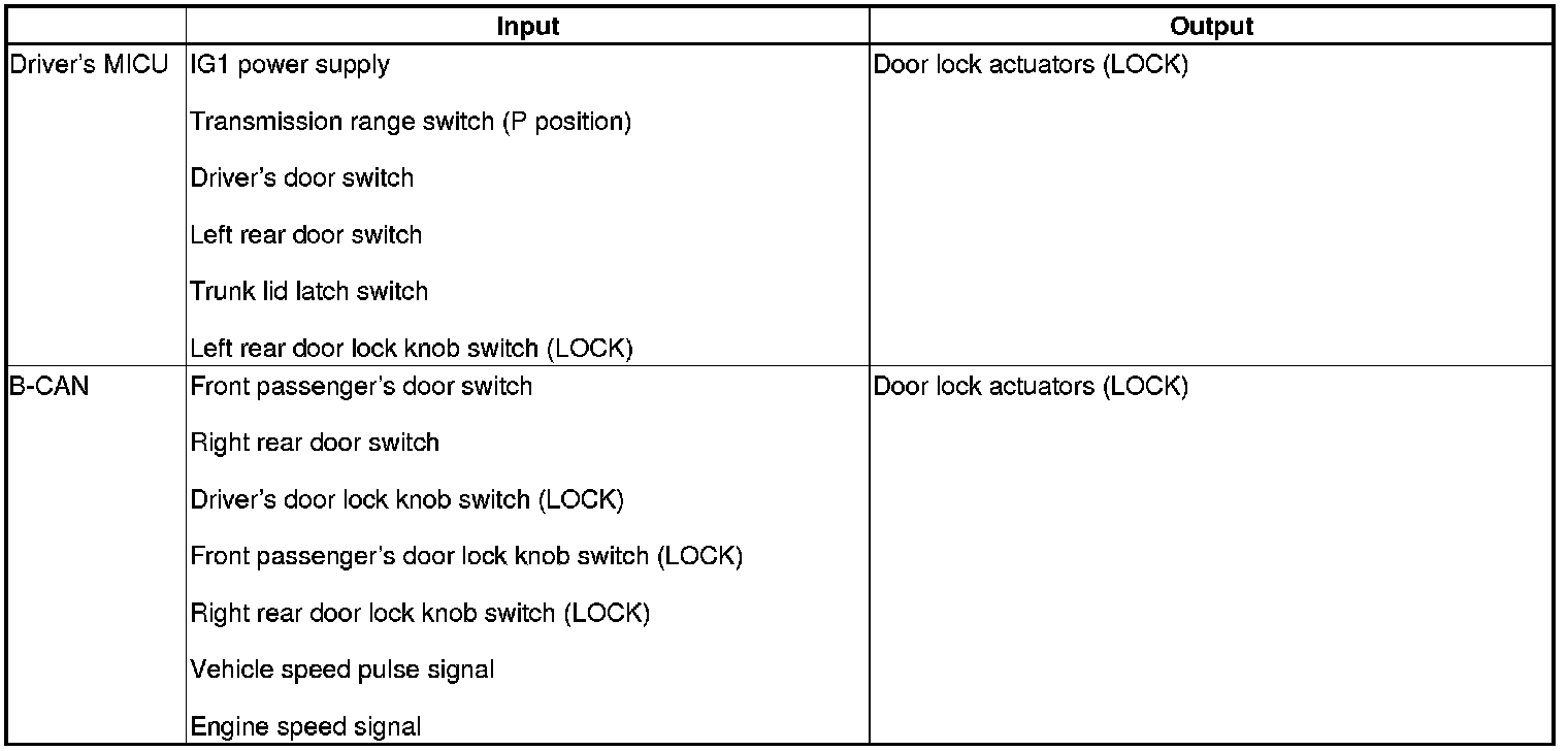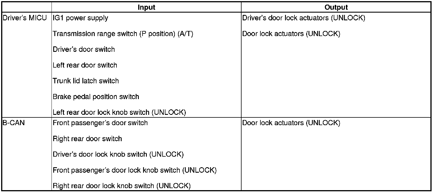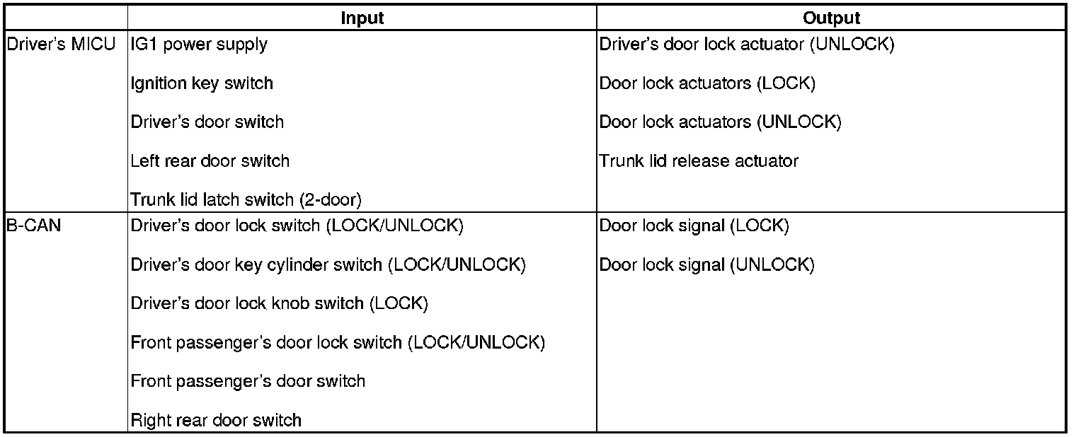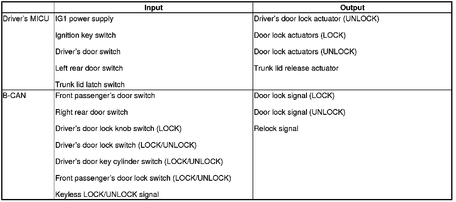 The driver's MICU control of the door lock actuators LOCK, UNLOCK, DRIVER'S UNLOCK, TRUNK UNLOCK is based on B-CAN door lock switch signals.