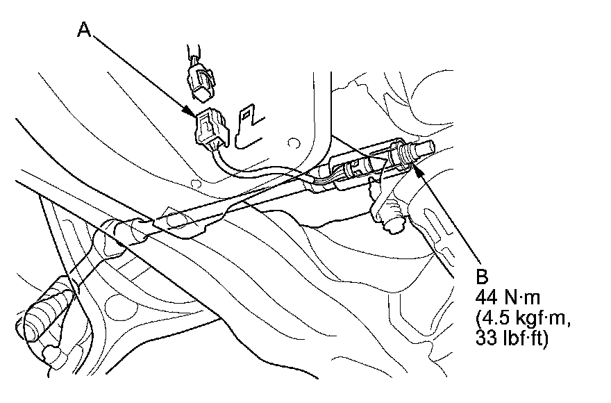 Disconnect the secondary HO2S 4P connector (A), then remove the secondary HO2S (B).