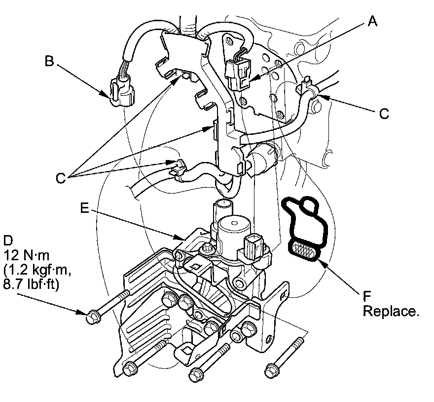 4. Remove the rocker arm oil control valve assembly (E) and the rocker arm oil control valve filter (F).