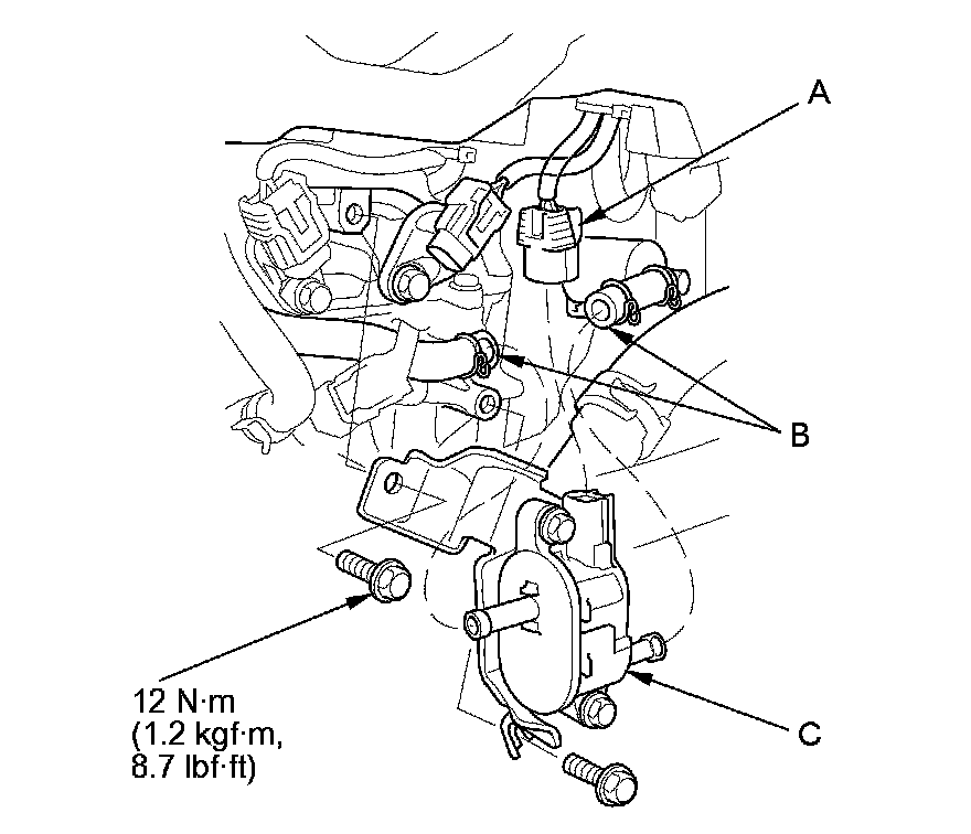 1. Disconnect the connector (A) and hoses (B) from the EVAP canister purge valve (C), then remove the EVAP canister purge valve assembly.