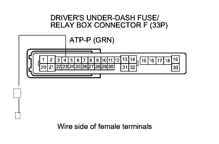 15. Check for continuity between driver's under-dash fuse/relay box connector F (33P) terminal No. 4 and body ground.