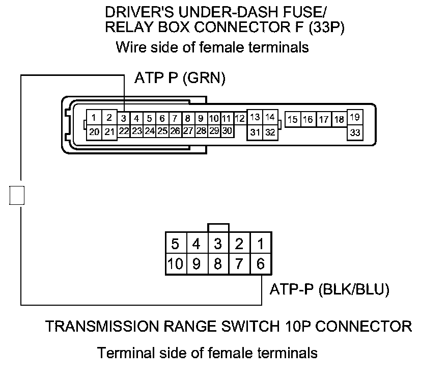 18. Check for continuity between driver's under-dash fuse/relay box connector F (33P) terminal No. 4 and transmission range switch 10P connector terminal No. 6.