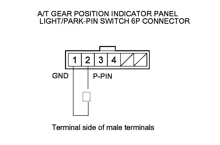 13. Check for continuity between A/T gear position indicator panel light/park-pin switch 6P connector terminals No. 1 and No. 2. Do not push the shift lever button.