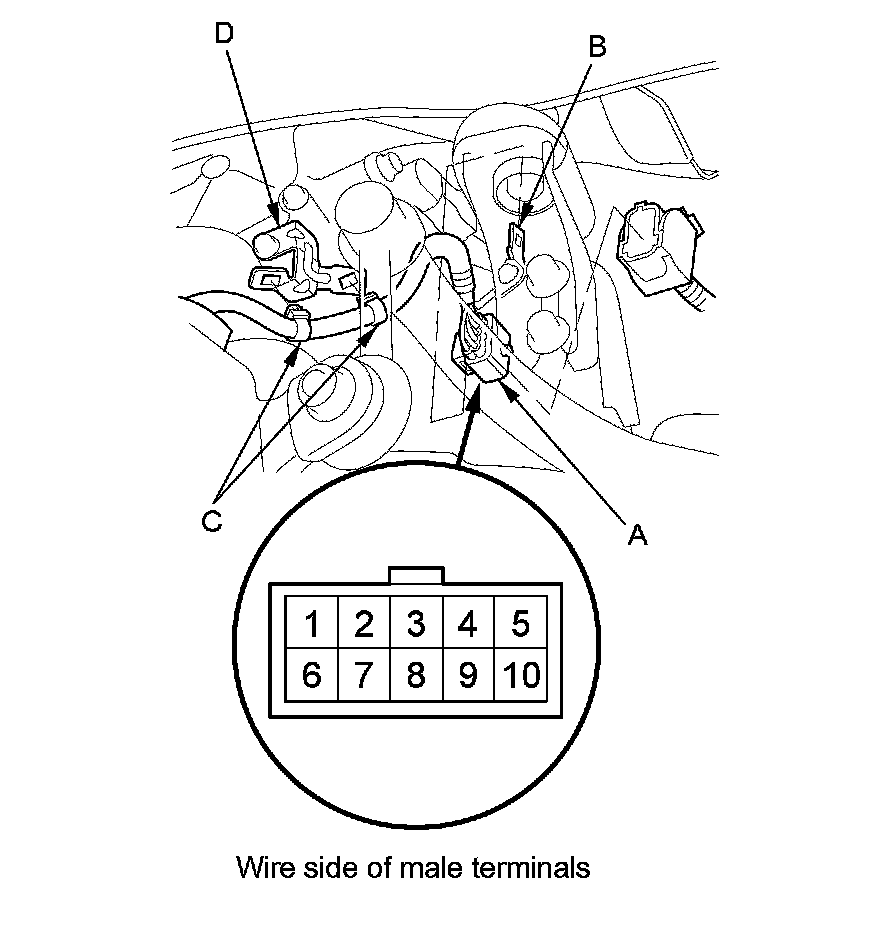 4. Remove the harness clamps (C) from the clamp bracket (D).