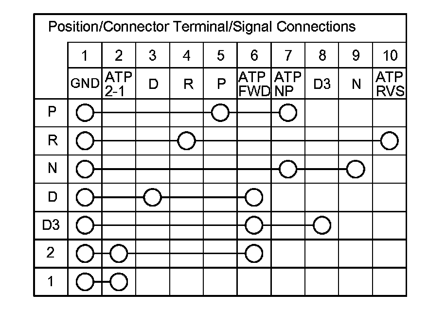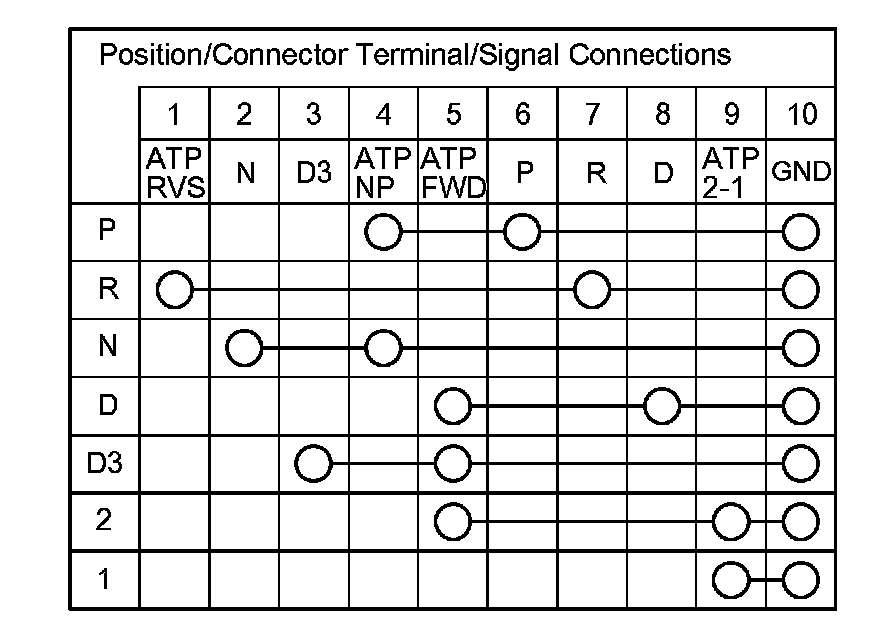 9. Check for continuity between the terminals at the transmission range switch connector. There should be continuity between the terminals in the following table for each transmission range switch position.
