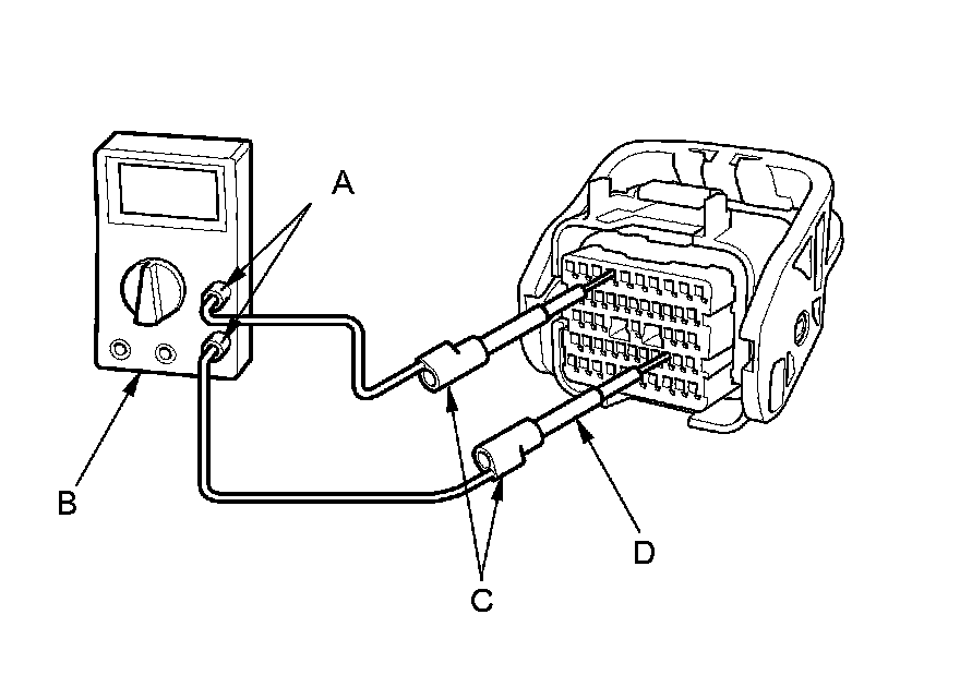 5. Connect one side of the patch cord terminals (A) to a commercially available digital multimeter (B), and connect the other side of the patch cord terminals (C) to a commercially available banana jack (Pomona Electronics Tool No. 3563 or equivalent) (D).