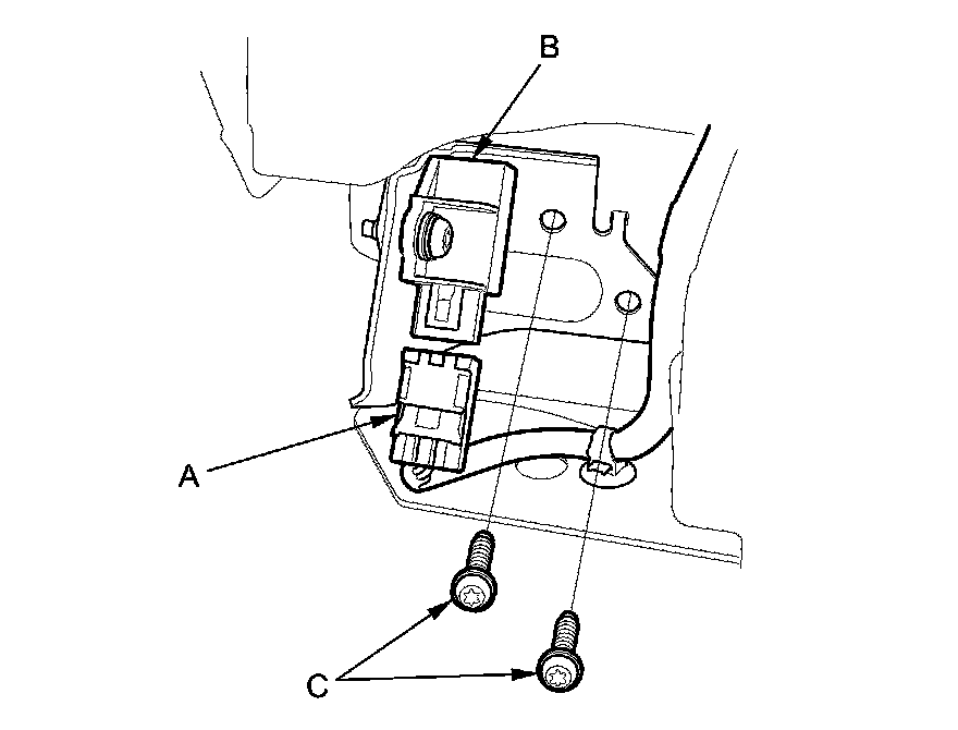 1. Install the front impact sensor (A) with new TORX bolts (B), using a TORX T30 bit. Connect the left or right engine compartment wire harness 2P connector (C) to the front impact sensor.