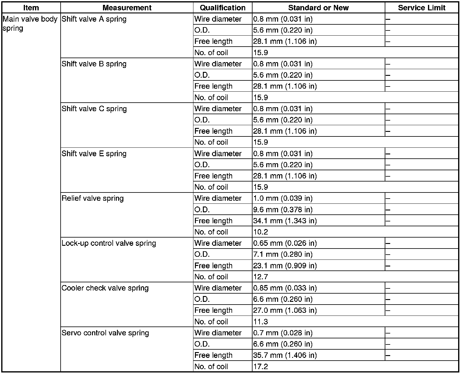 Main Valve Body spring Specification(s) (A/T)