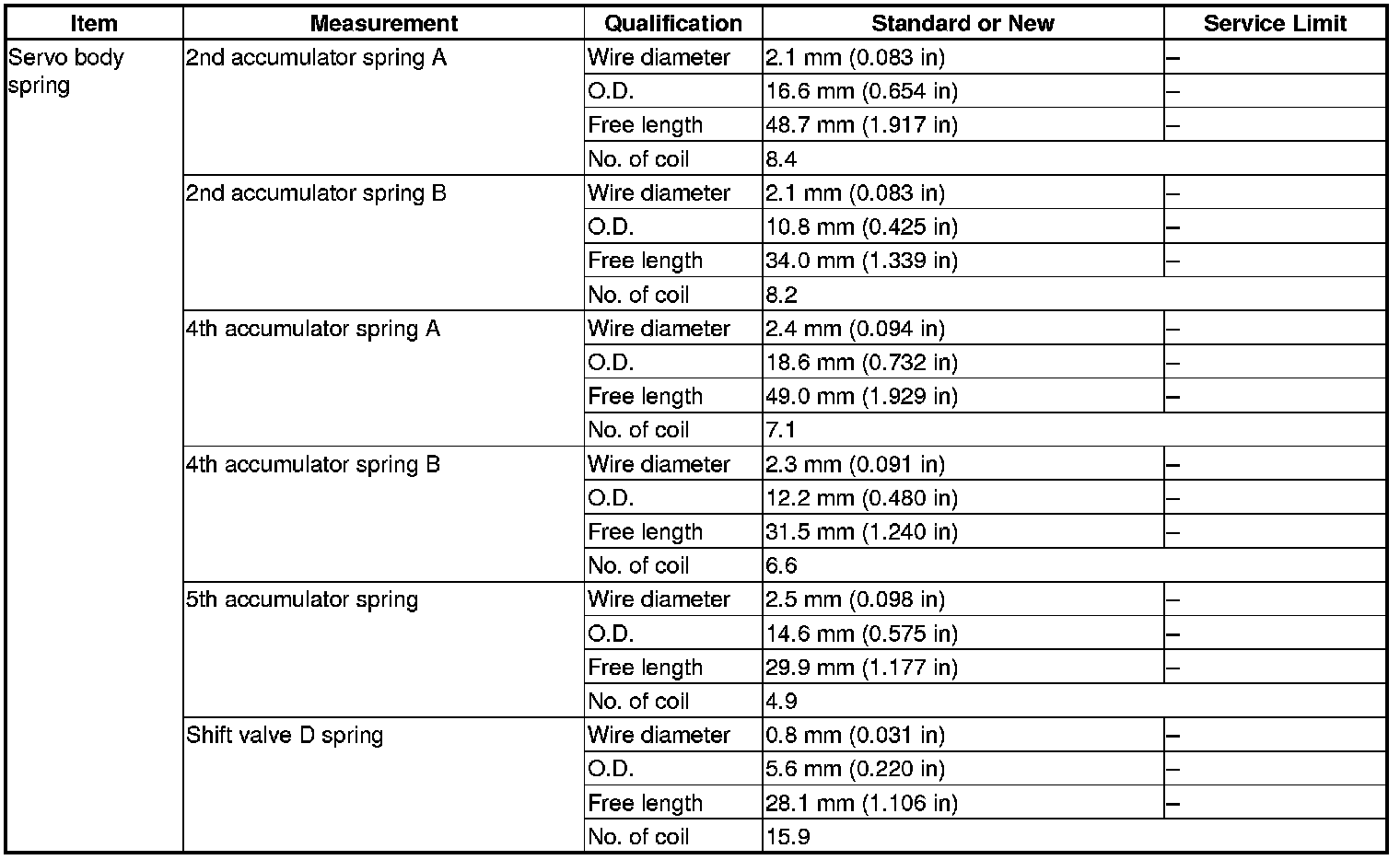 Servo Body Spring Specification(s) (A/T)