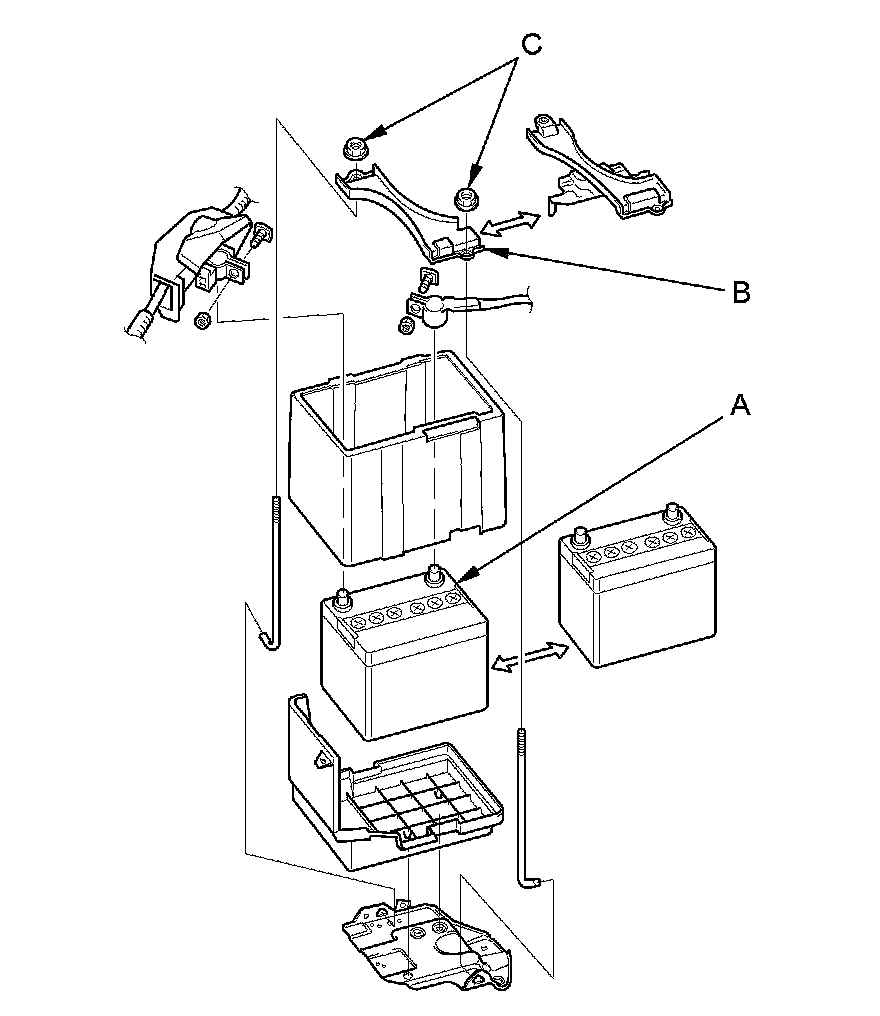 2. Remove the two nuts (A) securing the battery setting plate, then remove the battery setting plate (B) and the battery (C).
