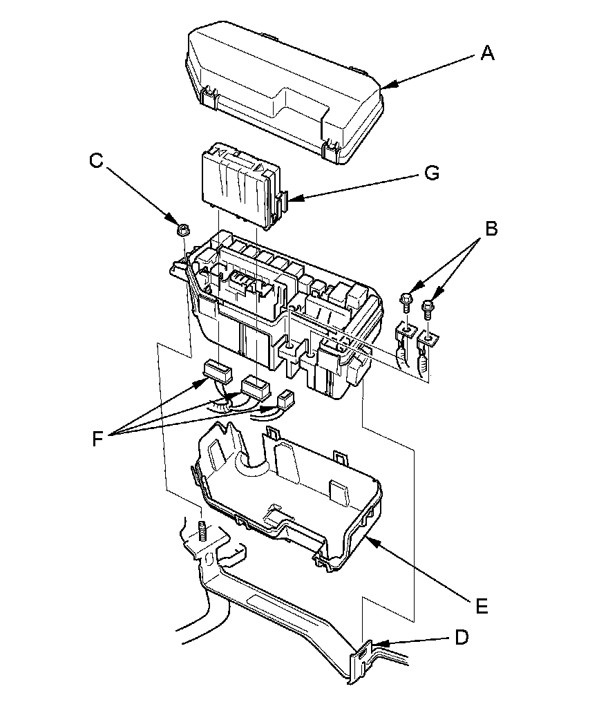 3. Remove the nut (C), and release the tab (D) bottom cover (E) from the under-hood fuse/relay box.