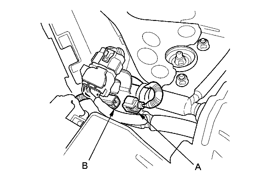 10. Make sure the shift lever is in N or P (A/T model) or neutral (M/T model), then disconnect the engine wire harness 1P connector (A). Connect a jumper wire from the battery positive terminal to the starter subharness 1P connector (B).