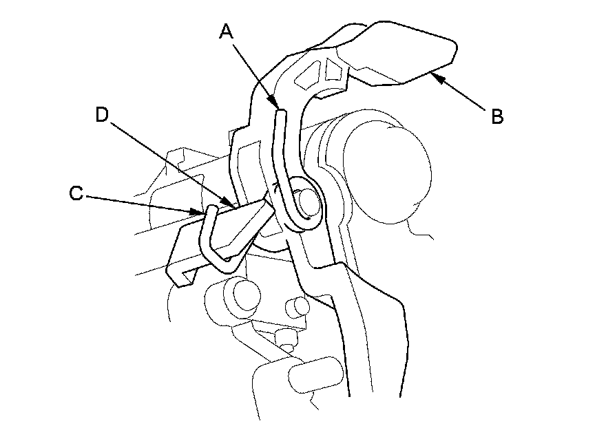 16. Make sure that the release spring end (A) is installed in the shift lock release (B), and the hooked end (C) is on the stop (D).