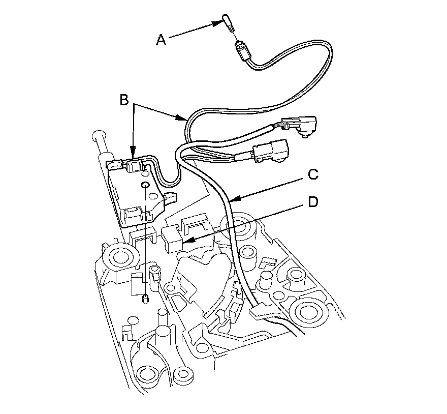 9. Remove the park pin switch/A/T gear position indicator panel light harness (B) and the shift lock solenoid harness (C) from the harness guide (D).