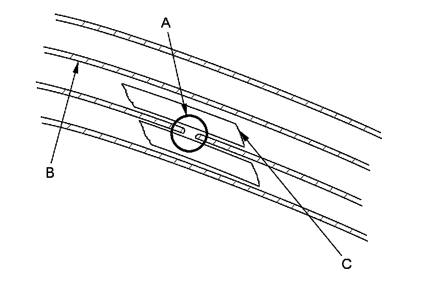 2. Carefully mask above and below the broken portion of the defogger wire (B) with cellophane tape (C).