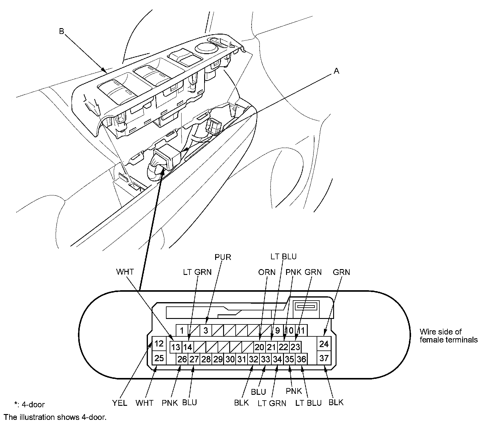 2. Disconnect the 37P connector (A) from the door power window master switch (B).