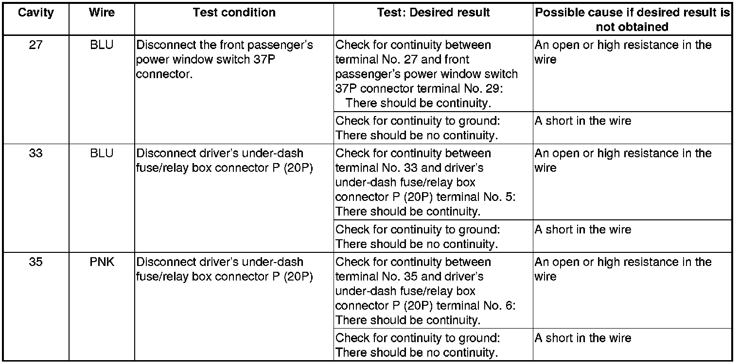 4. Reconnect the connector to the power window master switch, turn the ignition switch to ON (II), and do these input tests at the following connector.