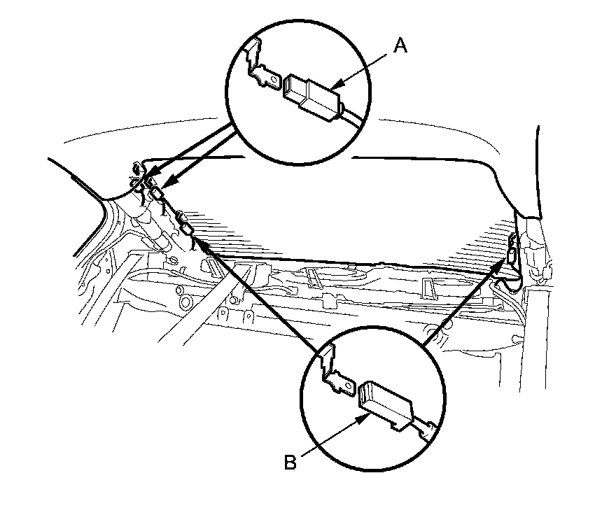 2. Disconnect the window antenna connectors (A) and the rear window defogger connectors (B). 4-door is shown; 2-door is similar.