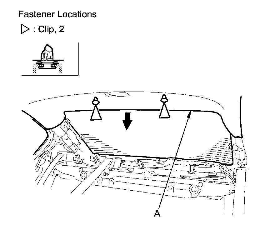 4. Pull down the rear area of the headliner (A) by detaching the clips. Take care not to bend the headliner excessively, or you may crease or break it. 4-door is shown; 2-door is similar.