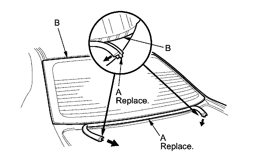 6. Remove the lower rubber dam (A) from the lower edge of the rear window (B). If necessary, cut the rubber dam with a utility knife. 4-door is shown; 2-door is similar.