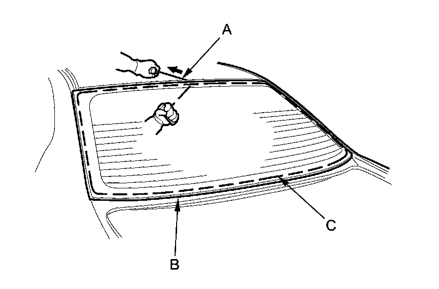 7. With a helper on the outside, pull the piano wire (A) back and forth in a sawing motion. Hold the piano wire as close to the rear window (B) as possible to prevent damage to the body, and carefully cut through the adhesive (C) around the entire rear window. 4-door is shown; 2-door is similar.