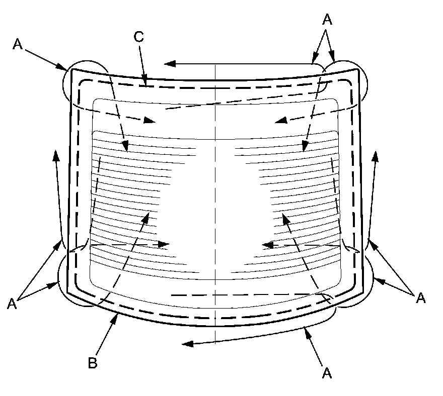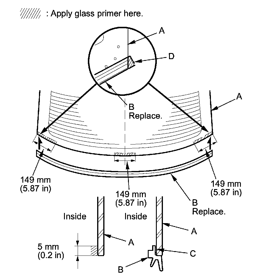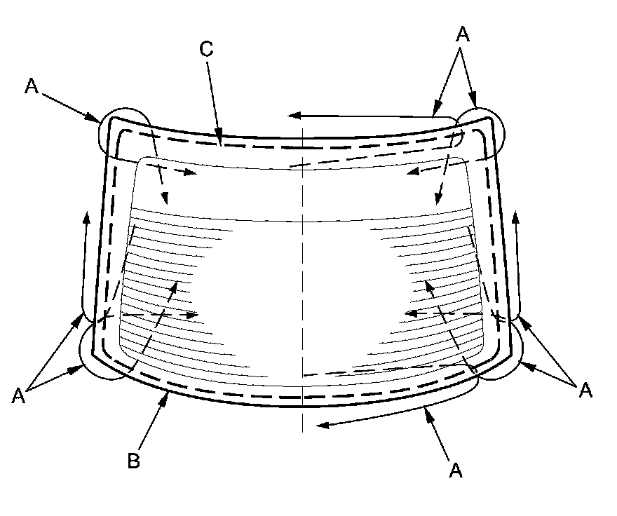 12. Apply glass primer to the edge of the rear window (A) where the lower rubber dam (B) will be attached as shown. Attach the lower rubber dam with adhesive tape (C) to the lower edge of the rear window: