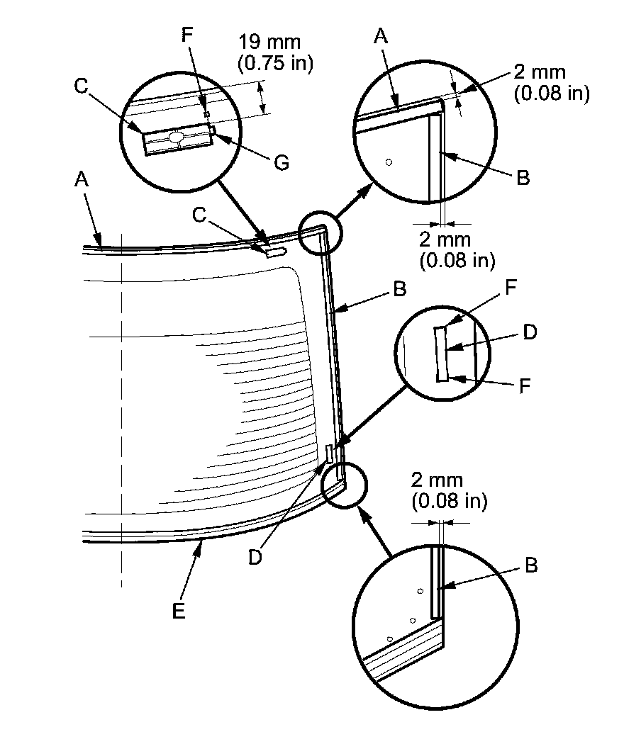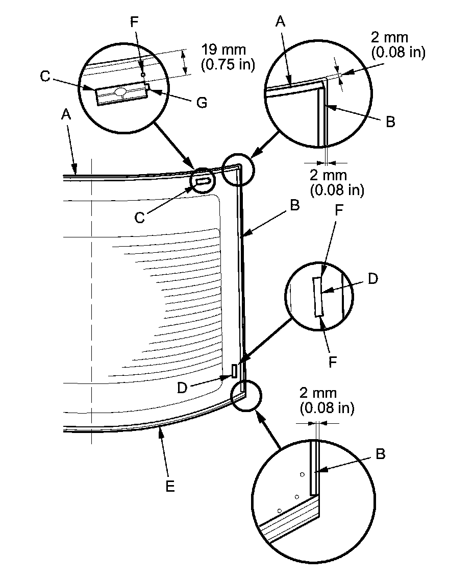 13. Apply glass primer to the upper clip mounting areas on the windshield, and let it dry. Attach the upper rubber dam (A), the side rubber dams (B), the upper clips (C), and the fasteners (D) with the adhesive tape to the inside face of the rear window (E) as shown.