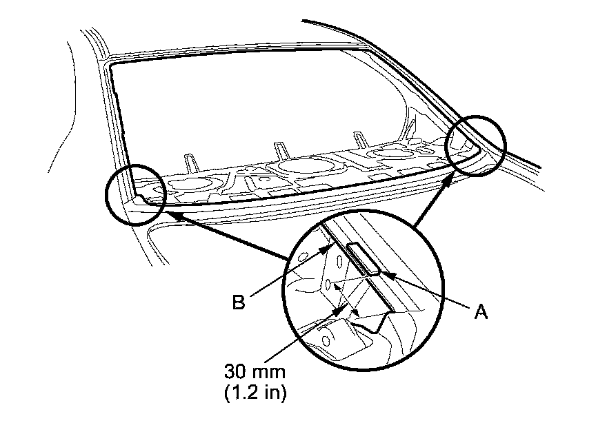 14. Attach the fasteners (A) with the adhesive tape to the rear window opening flange (B) of the body on both sides.