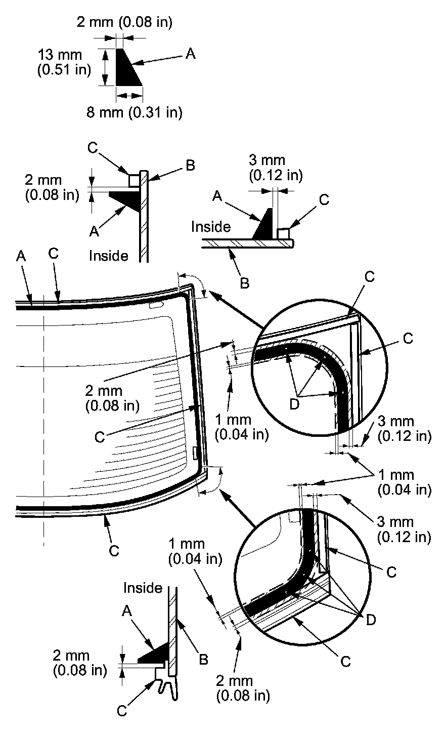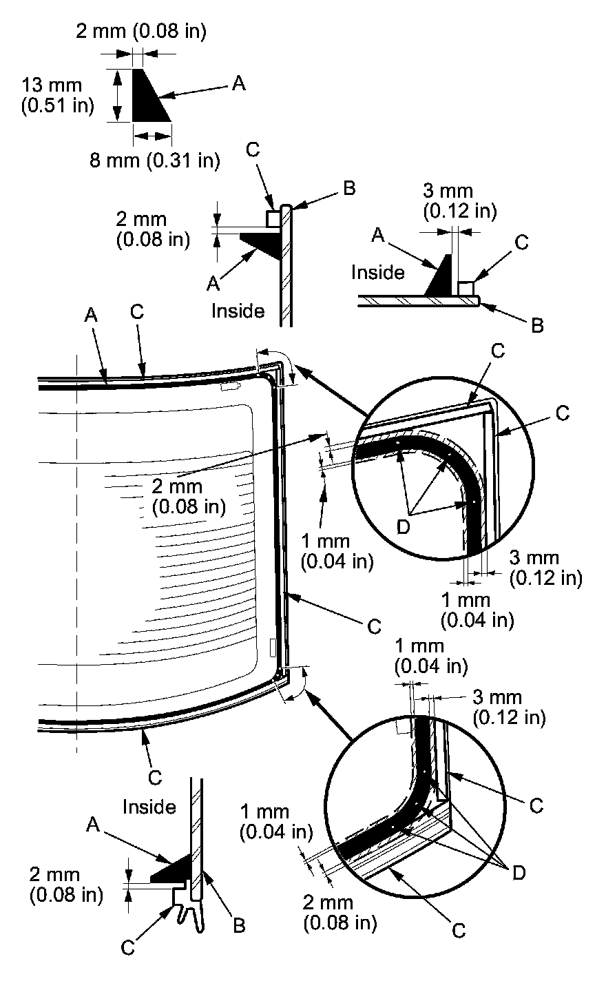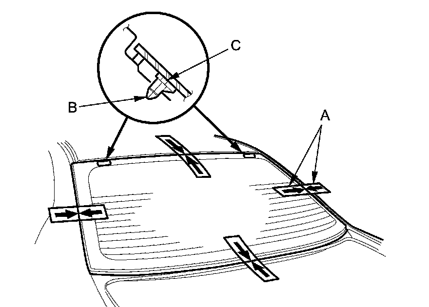 20. Put the cartridge on a caulking gun, and run a continuous bead of the adhesive (A) to the rear window (B) along the edge of the rubber dams (C) as shown: