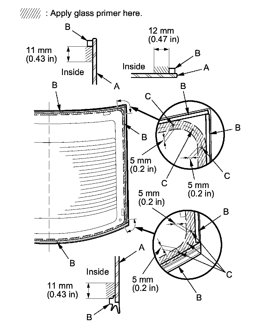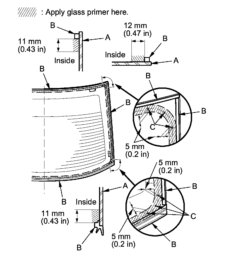 - Apply the glass primer to the corner areas of the rear window using the printed dots (C) on the rear window as a guide.