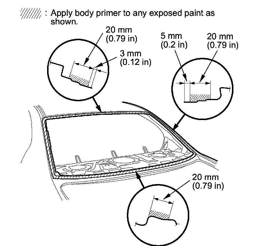18. Carefully apply a light coat of body primer to any exposed paint or metal around the flange where the new adhesive will be applied. Let the body primer dry for at least 10 minutes: