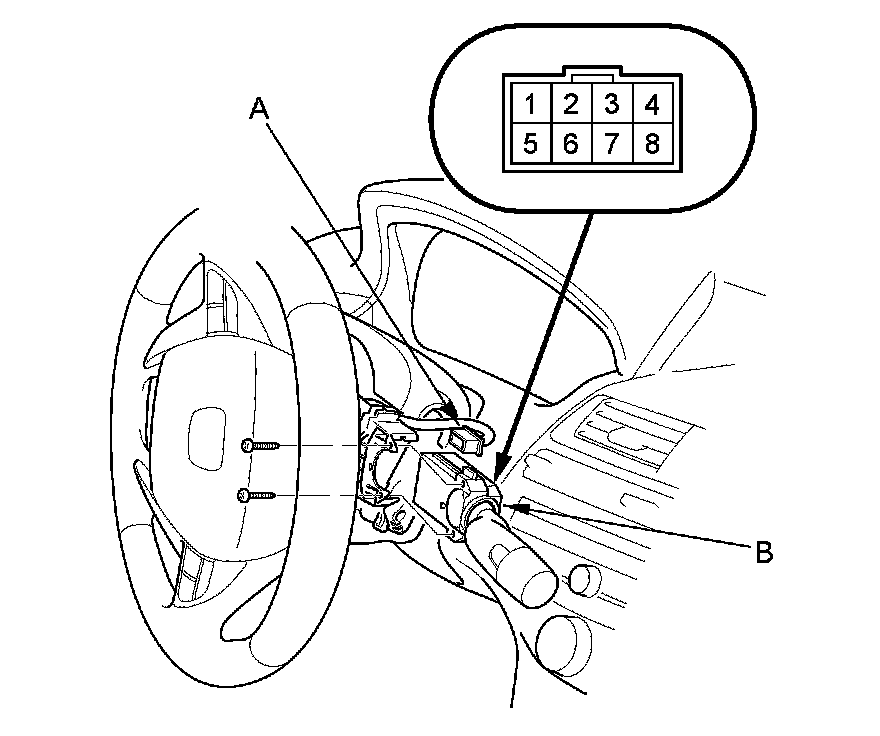 2. Disconnect the dashboard wire harness 8P connector (A) from the wiper/washer switch (B).
