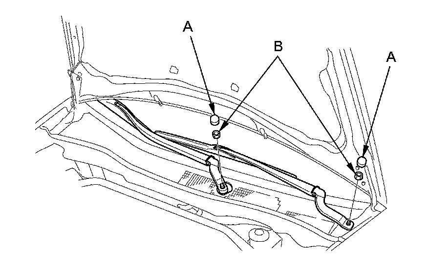 3. Install the link to the windshield wiper motor shaft, then align the mark (A) of the link and the mark (B) of the wiper linkage assembly (4-door), or align the link (A) and the mark (B) of the wiper linkage assembly (2-door).