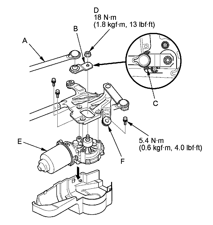 2. Install the wiper motor to the windshield wiper linkage assembly in the reverse order of removal.
