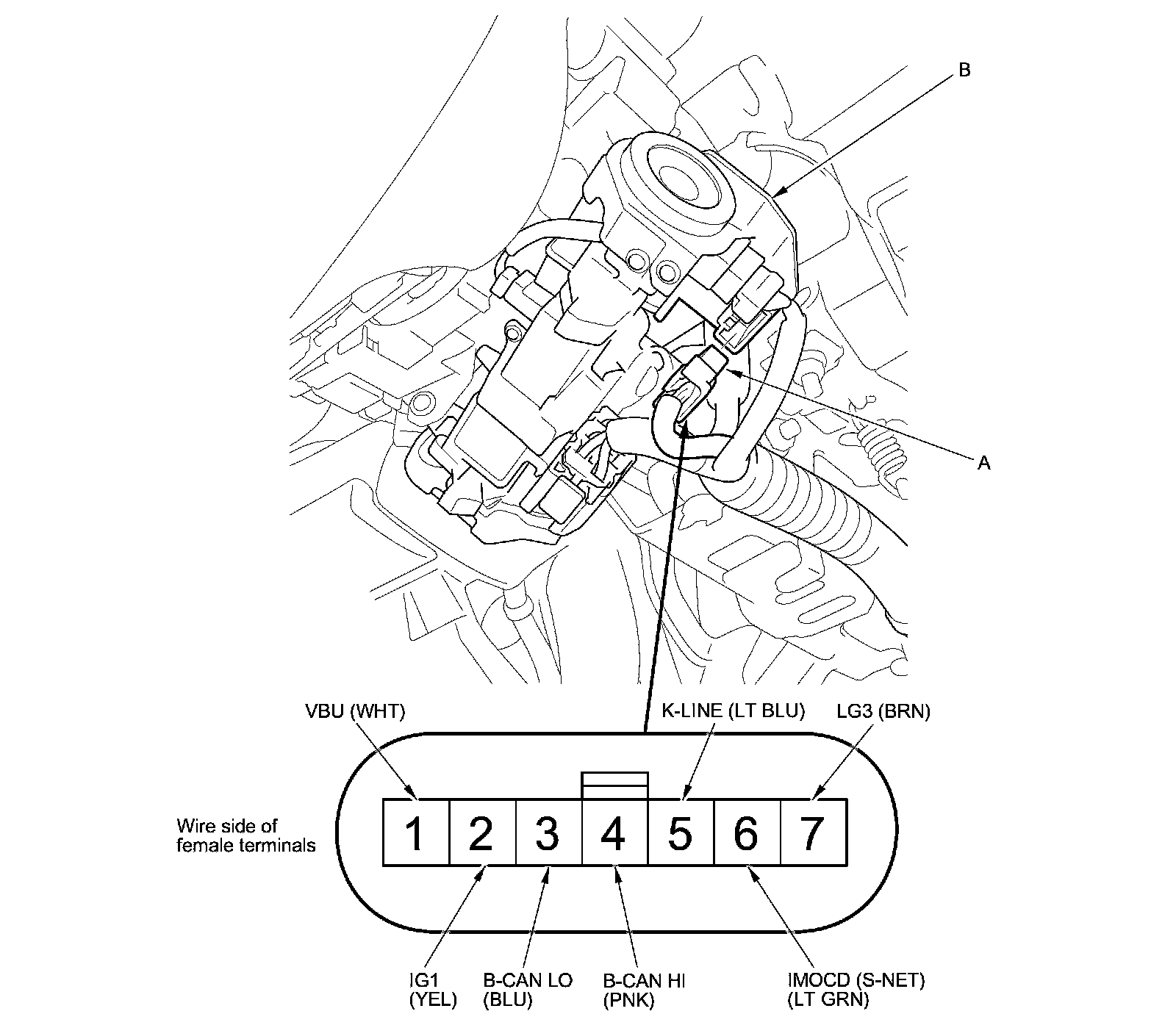 2. Disconnect the immobilizer-keyless control unit 7P connector (A) from the immobilizer-keyless control unit (B).