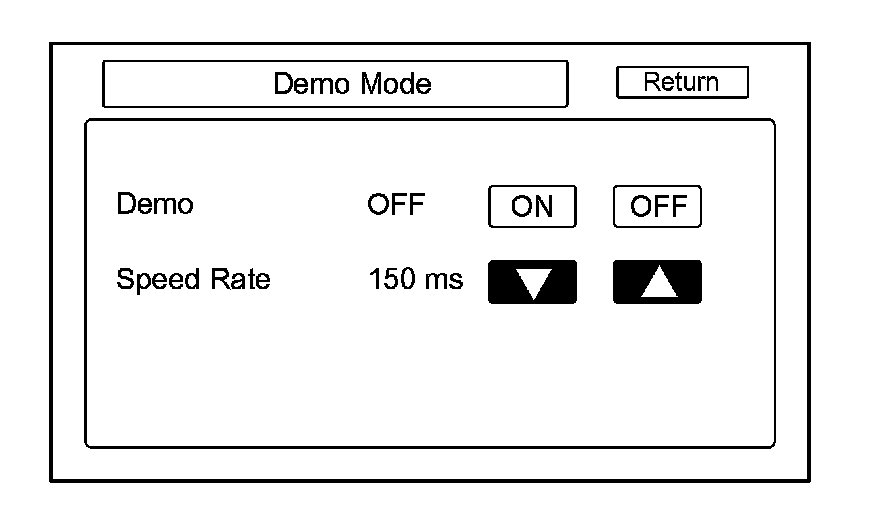 This screen is for factory use only, and should always be set to OFF. Occasionally the DEMO setting is turned ON when vehicles are being used at Auto Shows or similar events. Turning this feature on, allows the navigation system to automatically follow a route to a destination when the vehicle is stationary. The Speed Rate changes the speed of the demo mode.