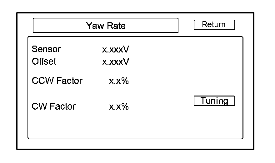 2. Road test: Drive the vehicle on a very straight road. Enter the diagnostic mode, select Yaw rate, and touch the Tuning button. While driving down a straight road, the white dots should trace a straight line across the screen. However, if you are driving on a straight road, and you notice the dots constantly dropping down or heading up as you drive, the navigation unit's yaw sensor is defective. You can touch Reset to clear ANG-Disp, and dotted lines.