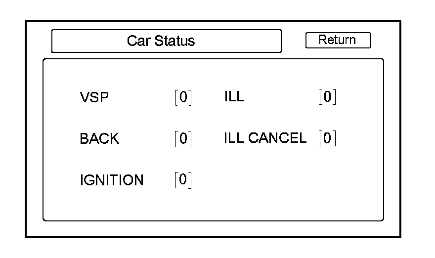Use this screen to confirm that the navigation unit is properly receiving input signals. Signals equal to (0) are OFF, and signals equal to (1) are ON. If the value on the display does not match the actual vehicle status, then check the wire carrying the signal.