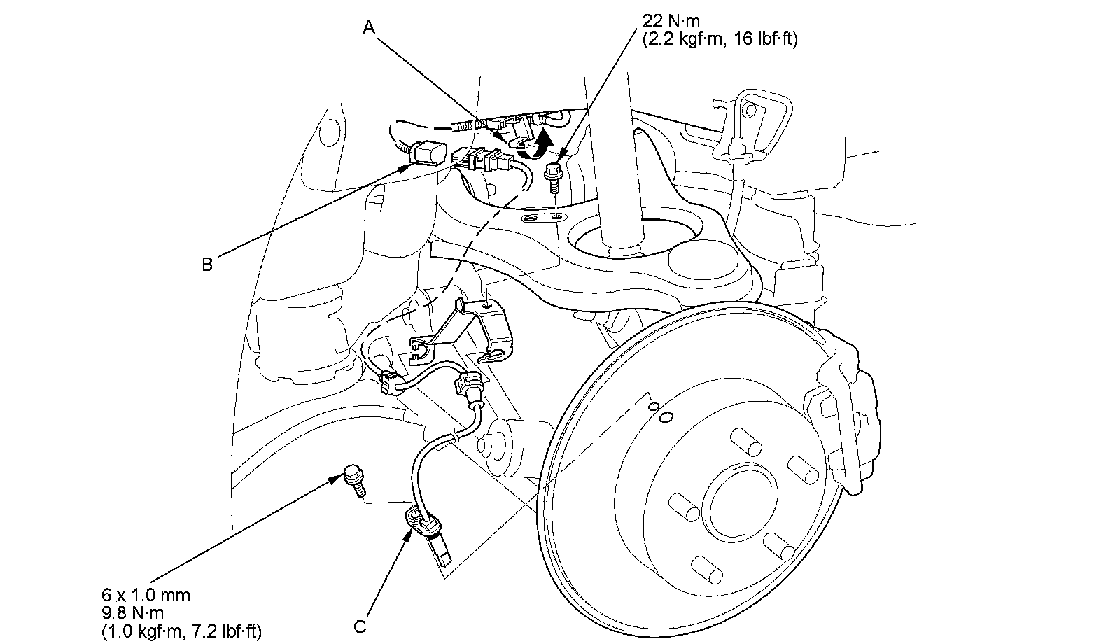 3. Remove the bolts and the wheel speed sensor (C).