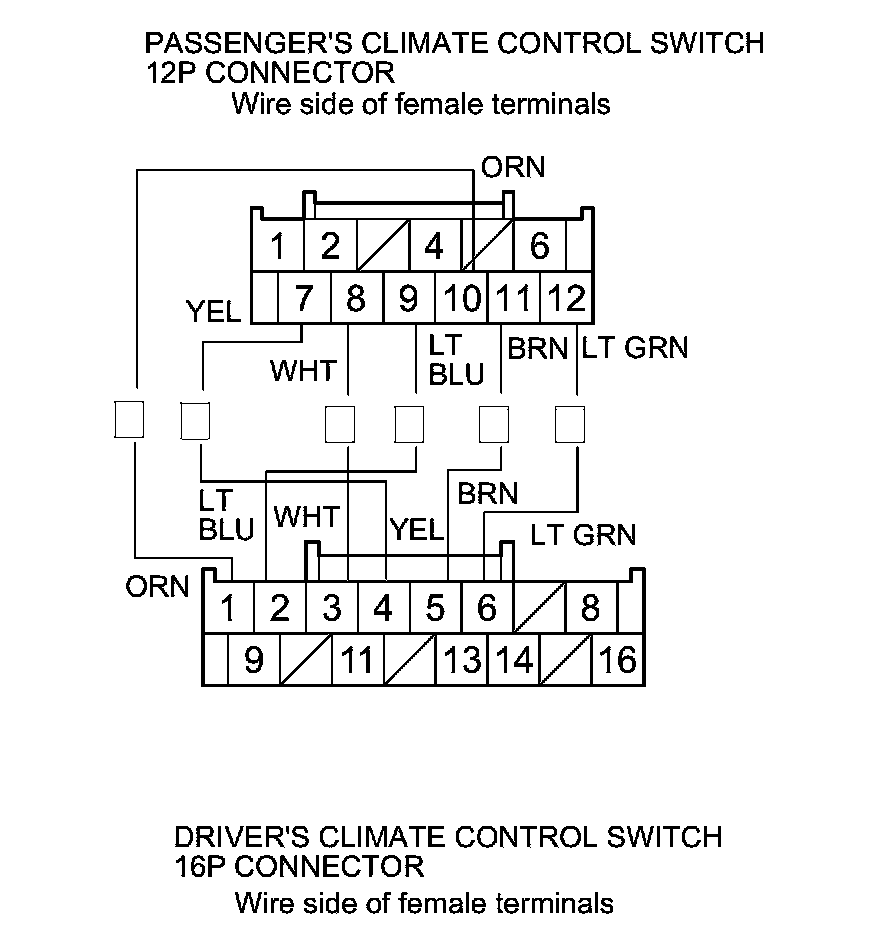 9. Check for continuity between the following terminals of the passenger's climate control switch 12P connector and the driver's climate control switch 16P connector.