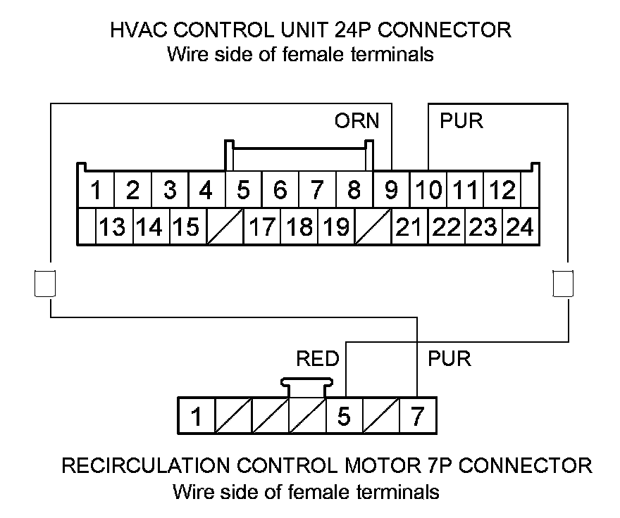 Check for loose wires or poor connections at the HVAC control unit 24P connector, and at the recirculation control motor 7P connector. If the connections are good, substitute a known-good HVAC control unit, and recheck. If the symptom/indication goes away, replace the original HVAC control unit HVAC Control Unit Removal/Installation.�