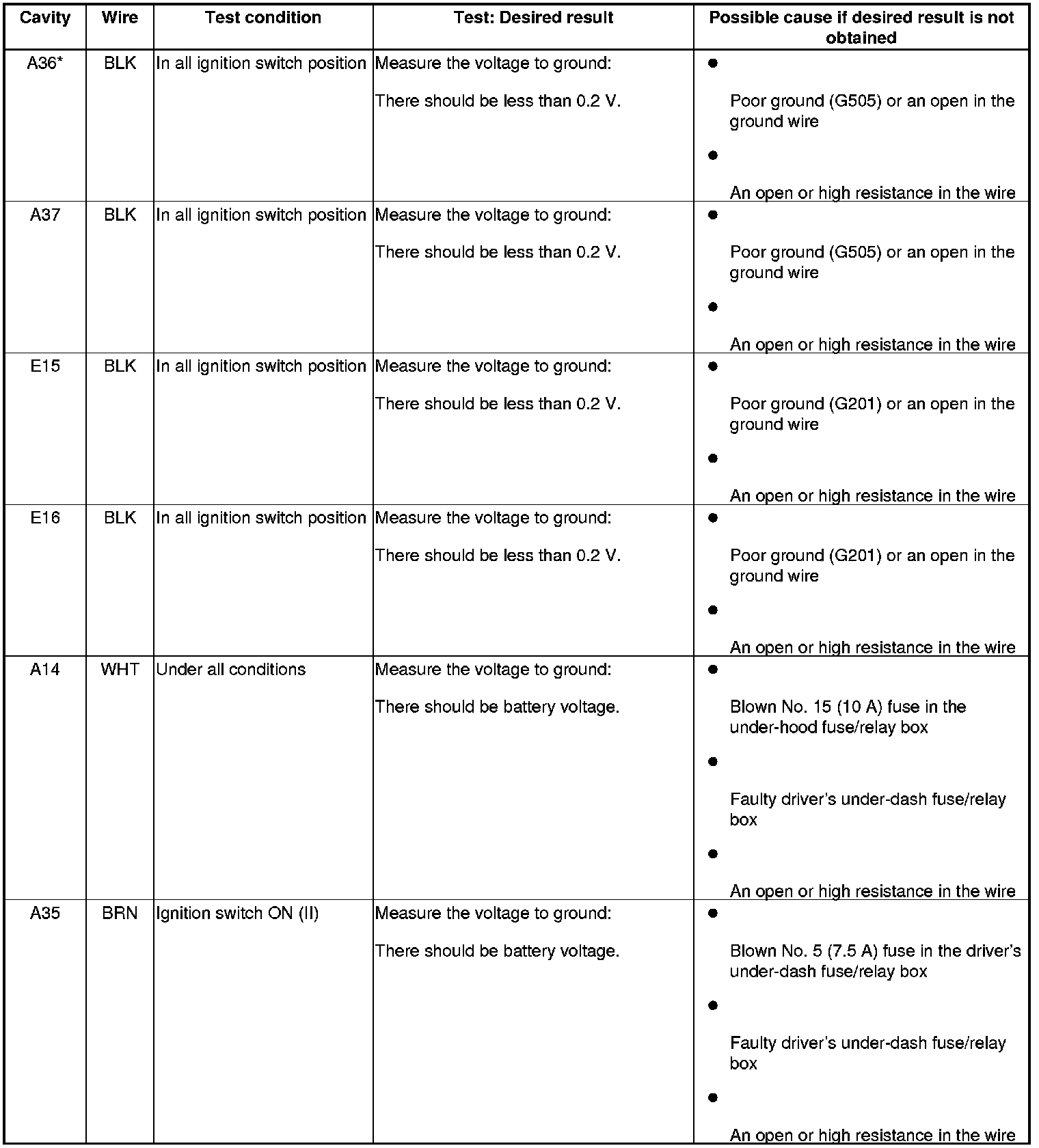 4. Reconnect the connectors to the driver's under-dash fuse/relay box, and do these input tests at the following connectors.