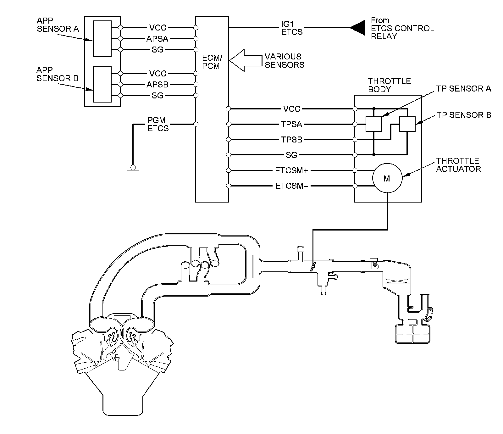 The electronic throttle control system consists of the throttle actuator, throttle position (TP) sensor A/B, accelerator pedal position (APP) sensor A/B, the electronic throttle control system (ETCS) control relay, and the ECM/PCM.