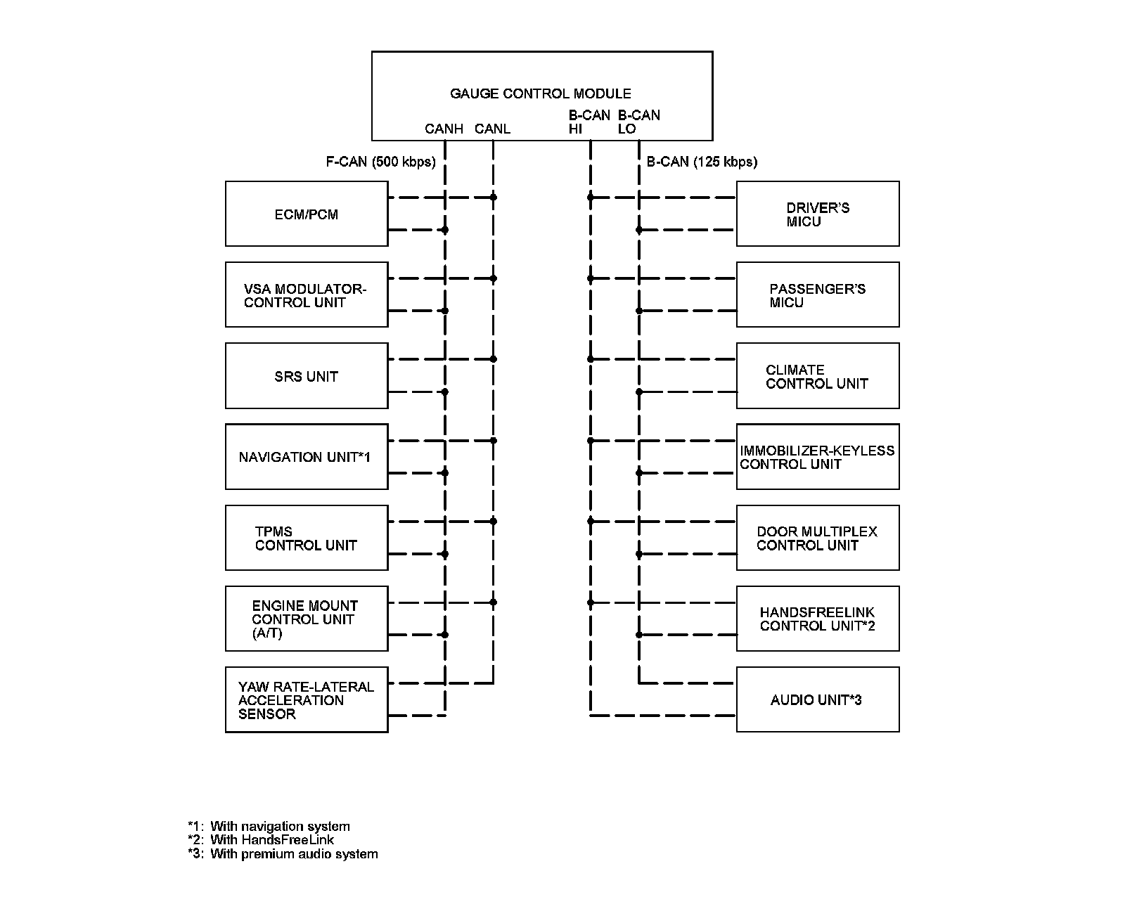 The body controller area network (B-CAN) and the fast controller area network (F-CAN) share information between multiple electronic control units (ECUs). B-CAN communication moves at a slower speed (125 kbps) for convenience related items and for other functions. F-CAN information moves at a faster speed (500 kbps) for "real time" functions such as fuel and emissions data. To allow both systems to share information, the gauge control module translates and relays the information from B-CAN to F-CAN and from F-CAN to B-CAN. This is called the Gateway Function.